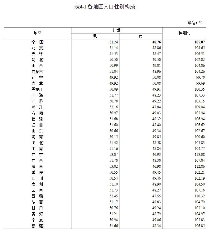 各地区人口性别构成。地区人口性别构成——东北女多男少 吉林总人口性别比较低31个省份中,总人口性别比在100以下的省份有2个,分别是吉林(99.69)和辽宁(99.7),这意味着这两个省份是女多男少。黑龙江为100.35,位列倒数第三。可以说,东北三省是性别比的“洼地”,远低于全国总人口性别比105.07。分析称,东北地区女多男少,一方面是因为东北执行计划生育政策最为彻底,独生子女观念早已深入人心,出生人口性别比106.3远低于全国平均水平;另一方面是因为,东北三省是人口流出省份,而流动人口中男性占比相对较高,“壮丁”出走,留下女性,女性寿命也更长,自然导致女多男少。反观总人口性别比较高的3个省份,分别是广东(113.08)、海南(112.86)和西藏(110.32),都在110以上。广东总人口性别比较高,也就是男多女少,其作为人口流入省份,正是大量的男性劳动力流入,一定程度上推高了人口性别比。