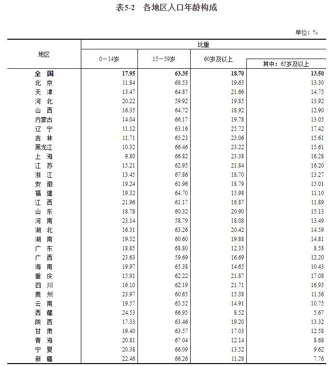 各地区人口年龄构成。地区人口年龄构成——西藏最“年轻”,辽宁最“老”从年龄构成来看,哪个省份最“年轻”?哪个省份最“老”?西藏最“年轻”。数据显示,西藏0—14岁人口比重为24.53%,全国较高;而60岁及以上人口比重为8.52%,全国较低;除西藏(5.67%)外,其他30个省份65岁及以上老年人口比重均超过7%。辽宁最“老”。数据显示,辽宁60岁及以上人口比重为25.72%,为全国较高。其中:65岁及以上人口比重为17.42%,也是全国较高。按照国际通行划分标准,当一个国家或地区65岁及以上人口占比超过7%时,意味着进入老龄化;达到14%,为深度老龄化;超过20%,则进入超老龄化社会。因此,辽宁已经是深度老龄化。辽宁在2018年公布的《辽宁省人口发展规划(2016—2030年)》中也直言,2016至2030年全省人口老龄化将加速发展,高龄化趋势明显,劳动年龄人口比重下降,客观上将降低经济潜在增长率,减弱人口红利,加大养老、医疗等社会保障和养老服务体系等公共服务压力。从全国范围来看, 12个省份进入深度老龄化阶段,这12个省份分别是辽宁、重庆、四川、上海、江苏、吉林、黑龙江、山东、安徽、湖南、天津和湖北。