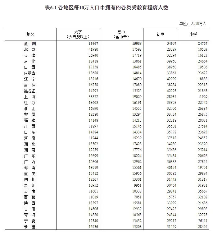各地区每10万人口中拥有的各类受教育程度人数。人口受教育情况——北京最有“文化”人口受教育程度的高低,关系着“人口质量红利”,影响着一个地区的发展前景。普查数据显示,全国人口中,具有大学文化程度的人口为21836万人。与2010年相比,每10万人中具有大学文化程度的由8930人上升为15467人,15岁及以上人口的平均受教育年限由9.08年提高至9.91年。其中,北京每10万人中具有大学文化程度的为41980人,为全国较高;15岁及以上人口平均受教育年限12.64年,也是全国较高。也就是北京人口最有“文化”。人口版图的变化,背后也是经济格局的变迁。“大国点名”已经结束,但人口变迁和竞逐仍在继续。