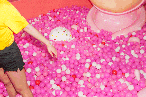 在软绵绵的海洋球里从滑梯上飞冲而下投入柔软海洋球的怀抱中享受被海洋球瞬间包围的震撼快意