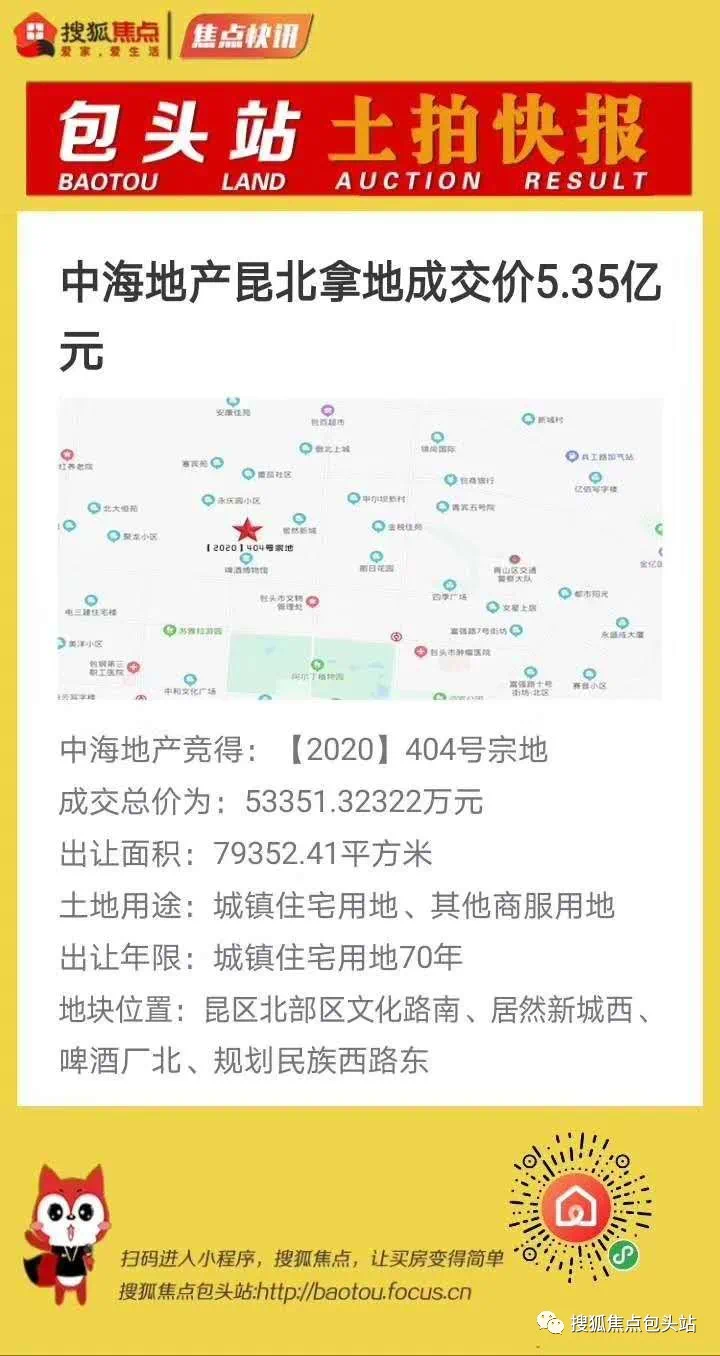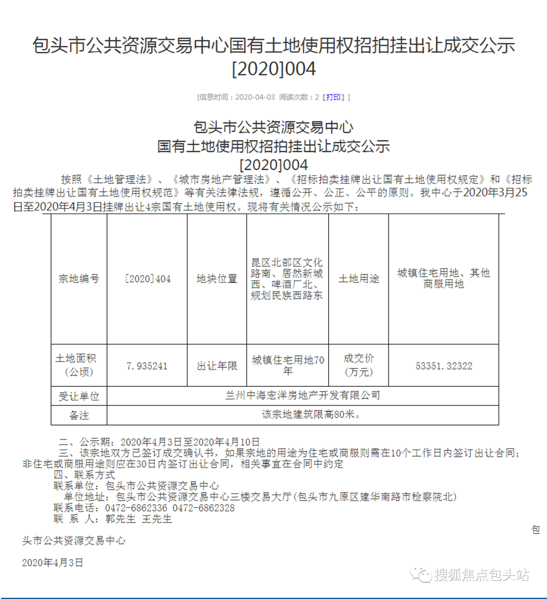 4月3日,从包头市公共资源交易中心了解到,2020年第4号土拍交易由兰州中海宏洋房地产开发有限公司竞得了【2020】404号宗地。该地块面积为79352.41平方米,土地用途为城镇住宅用地、其他商服用地;出让年限为城镇住宅用地70年。成交总价是53351.32322万元,楼面单价约为2923元/平方米。